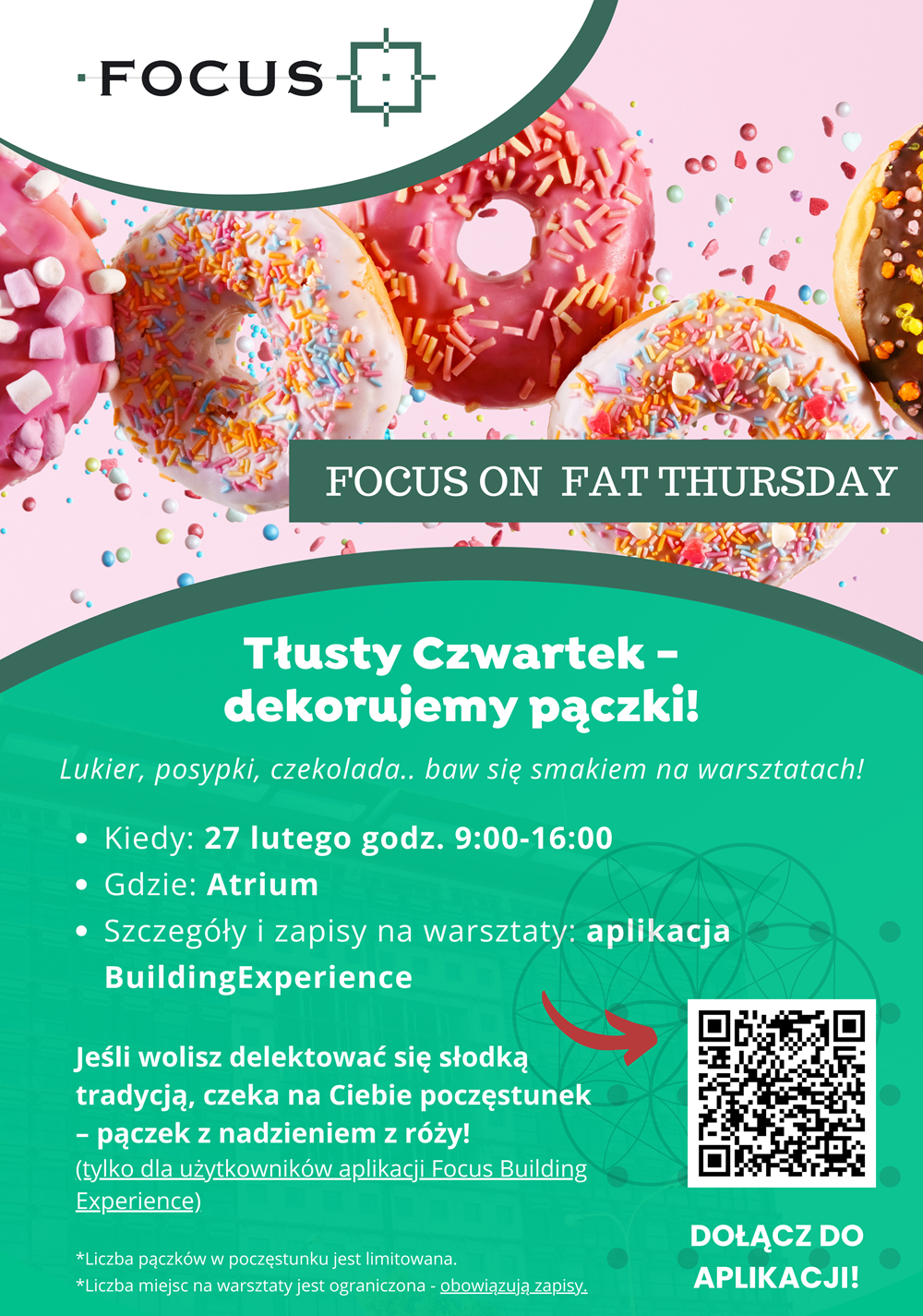 27 lutego od godziny 9:00 do 16:00 spotkajmy się w atrium budynku gdzie wspólnie, różnymi technikami, będziemy dekorować pączki. Uczcij z nami święto wszystkich łasuchów!